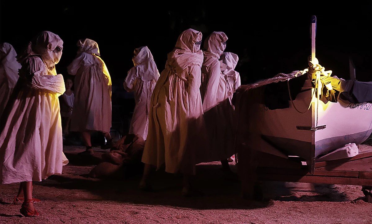 La mort amb cap de rata personifica la pesta, que entra a Santa Maria d’Arenys. Al ritme del seu estendard, amb una dansa punyent i solemne, els encontrats —nom amb què també s’anomenava els empestats— escampen el morbo pestífer per tota la vila.